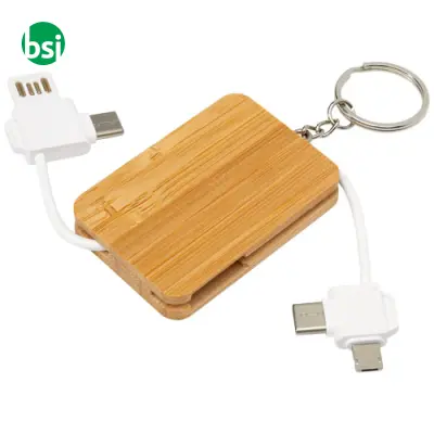 Cavo di ricarica 6 in 1 personalizzabile con portachiavi Reel in bambù. Sostenibile, elegante e pratico, perfetto per tutti!
