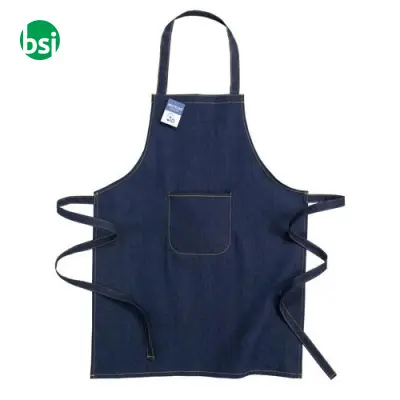 Grembiule in denim riciclato, perfetto per ristoranti e laboratori creativi. Personalizzabile con stampa o ricamo, unisce sostenibilità e stile.