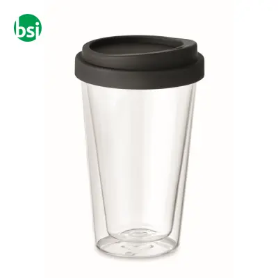 Bicchiere in vetro borosilicato con coperchio in silicone, capacità 350ml, elegante e personalizzabile. Perfetto per ogni occasione!