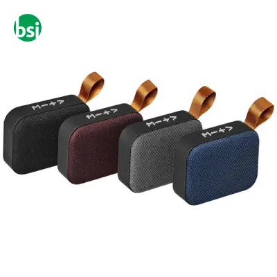 Speaker Bluetooth personalizzati in tessuto Fashion: suono potente, design elegante, durata 2 ore. Scegli tra Nero, Grigio, Blu royal!