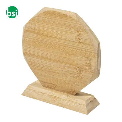 Trofeo ottagonale in bambù naturale ecosostenibile. Premio green ed elegante personalizzabile con incisione logo al miglior prezzo di mercato.