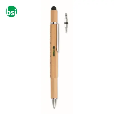 Penna livella in bamboo elegante e versatile, con righello e punte per viti. Ideale per gadget promozionali eco-friendly!