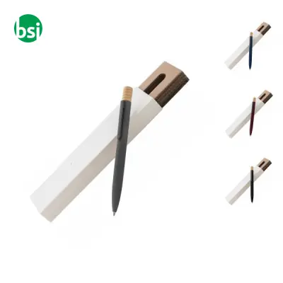 La Penna a sfera TALBOO è un esempio perfetto di sostenibilità e design raffinato. Realizzata in alluminio riciclato, questa penna è caratterizzata da un meccanismo a rotazione che ne garantisce un utilizzo fluido e comodo. Il fusto gommato offre una presa sicura, mentre gli eleganti componenti color canna di fucile e il cappuccio in bamboo la rendono un gadget distintivo per ogni occasione. Inoltre, viene fornita con un refill blu, pronto all'uso, e un astuccio in cartoncino kraft, ideale per presentarne il valore ecologico e stilistico. Perfetta per chi desidera unire funzionalità e responsabilità ambientale.