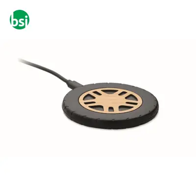 Caricabatterie wireless 15W in ABS riciclato con top in bamboo. Ricarica rapida, compatibile con iPhone e Android. Scegli la sostenibilità!