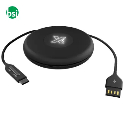 Cavo di ricarica SCX.design C18 con logo luminoso, tre connettori e custodia in silicone. Perfetto per viaggi e eco-friendly!