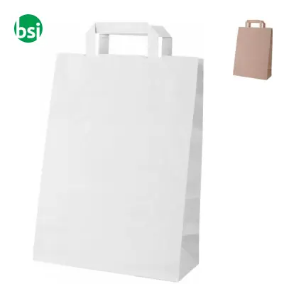 Sacchetto di carta con manico piattina, ideale per negozi e eventi. Resistente, capienza 3 kg, personalizzabile. Scegli il tuo colore!