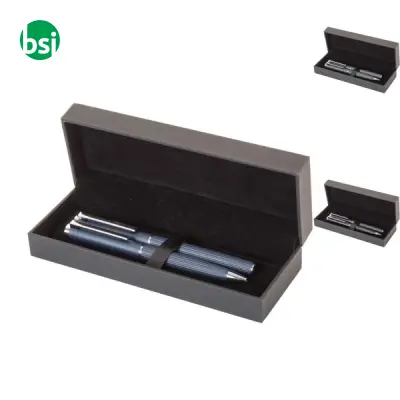Set elegante composto da penna a sfera e roller in metallo, personalizzabile e confezionato in regalo. Ideale per ogni occasione.