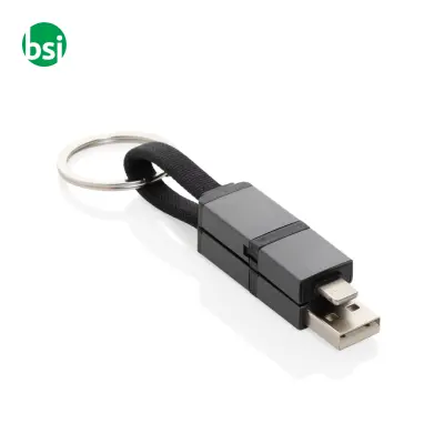 Cavo 4in1 veloce 60W, realizzato con materiali riciclati. Compatto, con attacco per portachiavi. Ricarica rapida per tutti i dispositivi!